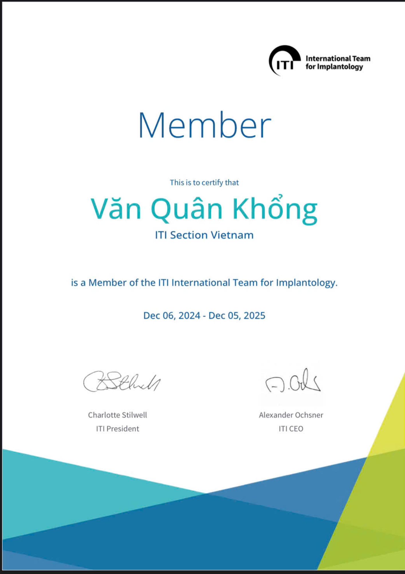| Thành viên hội cấy ghép implant quốc tế International Team for Implantology (ITI) – Tổ chức uy tín hàng đầu thế giới trong lĩnh vực Implant nha khoa |
