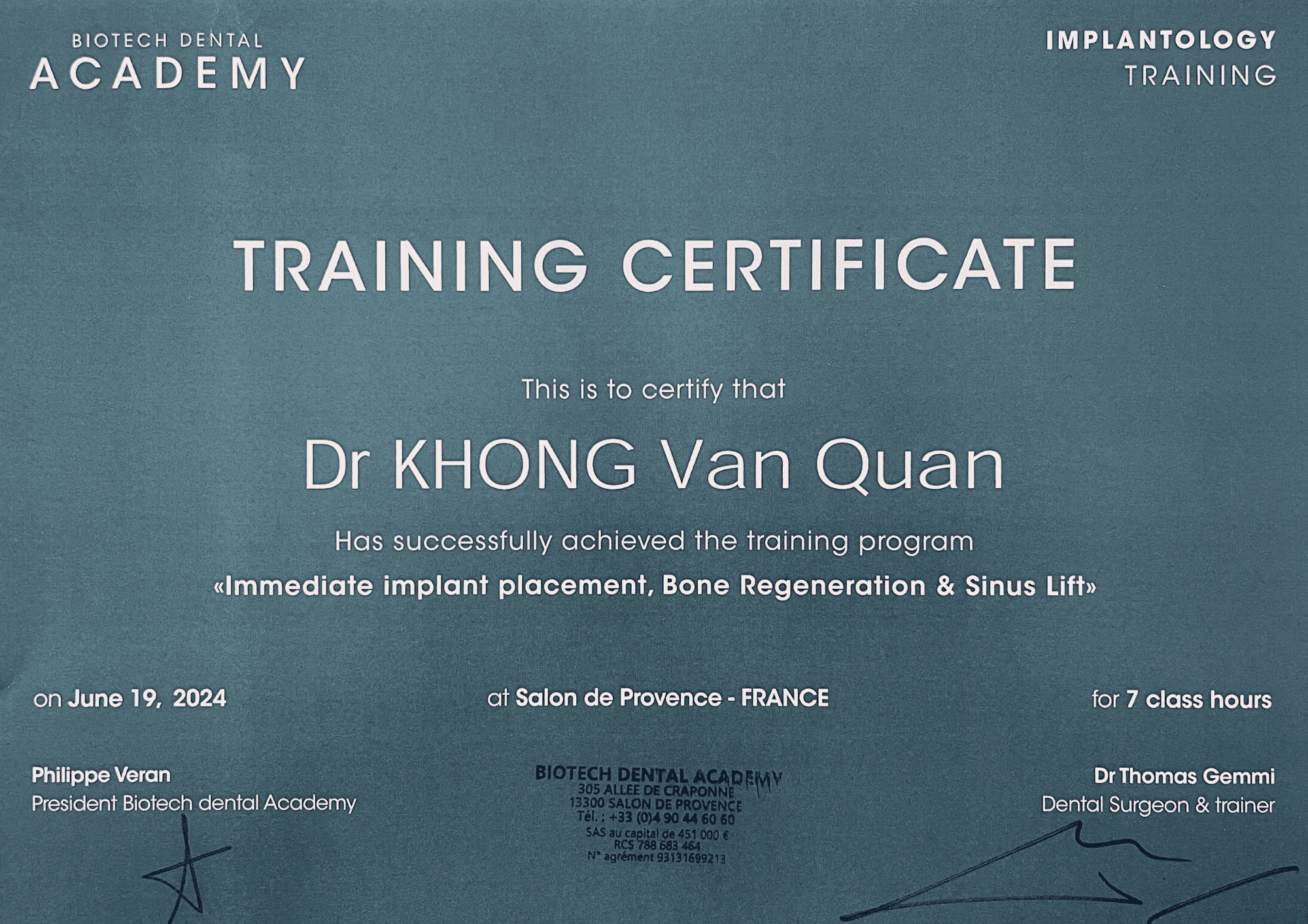 | Chứng chỉ đào tạo quốc tế Cấy ghép Implant tức thì, tái tạo xương và nâng xoang tại Biotech Dental Academy – Pháp |