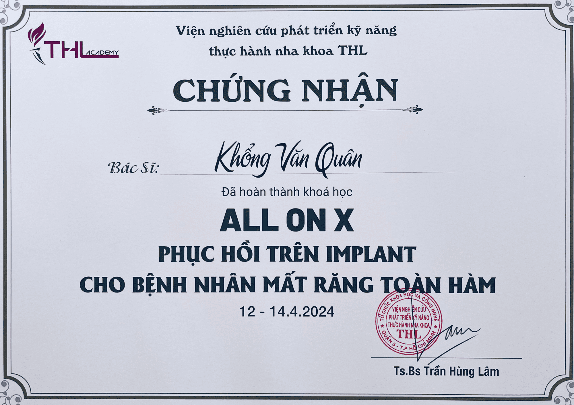 | Chứng nhận phục hồi Implant toàn hàm tại viện nghiên cứu THL Academy |