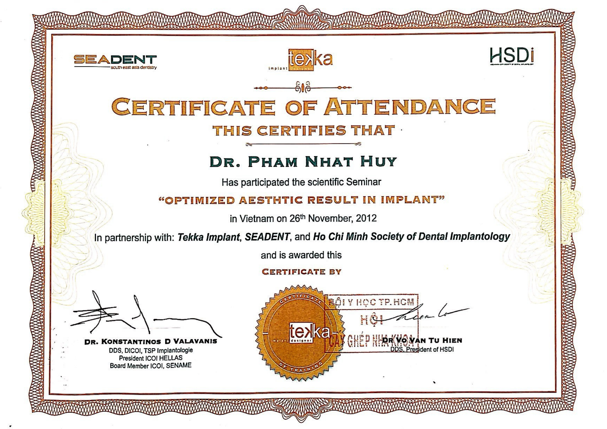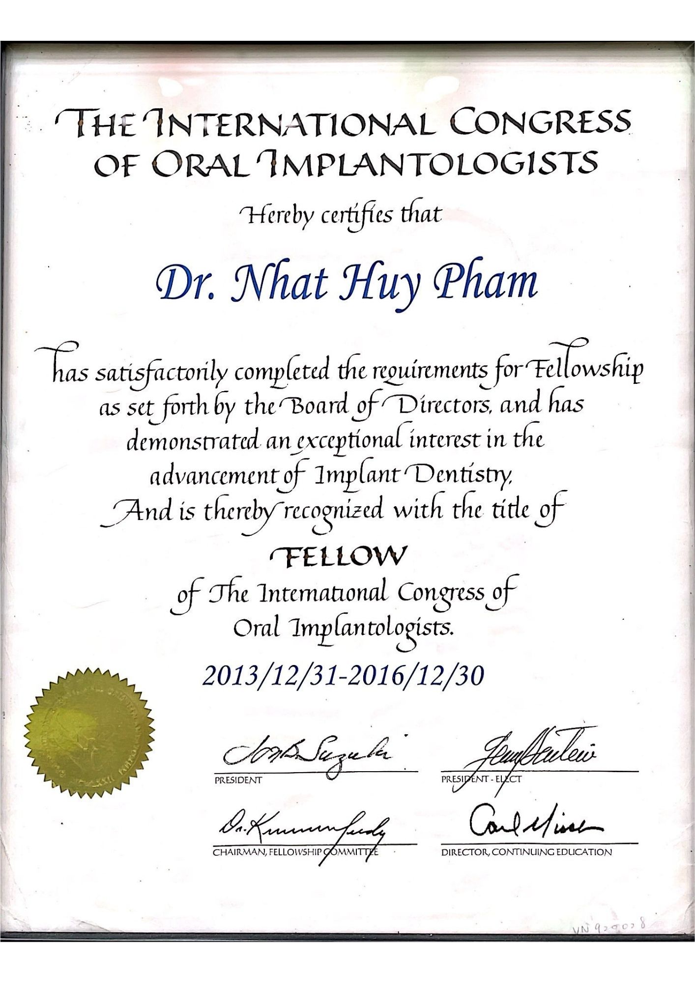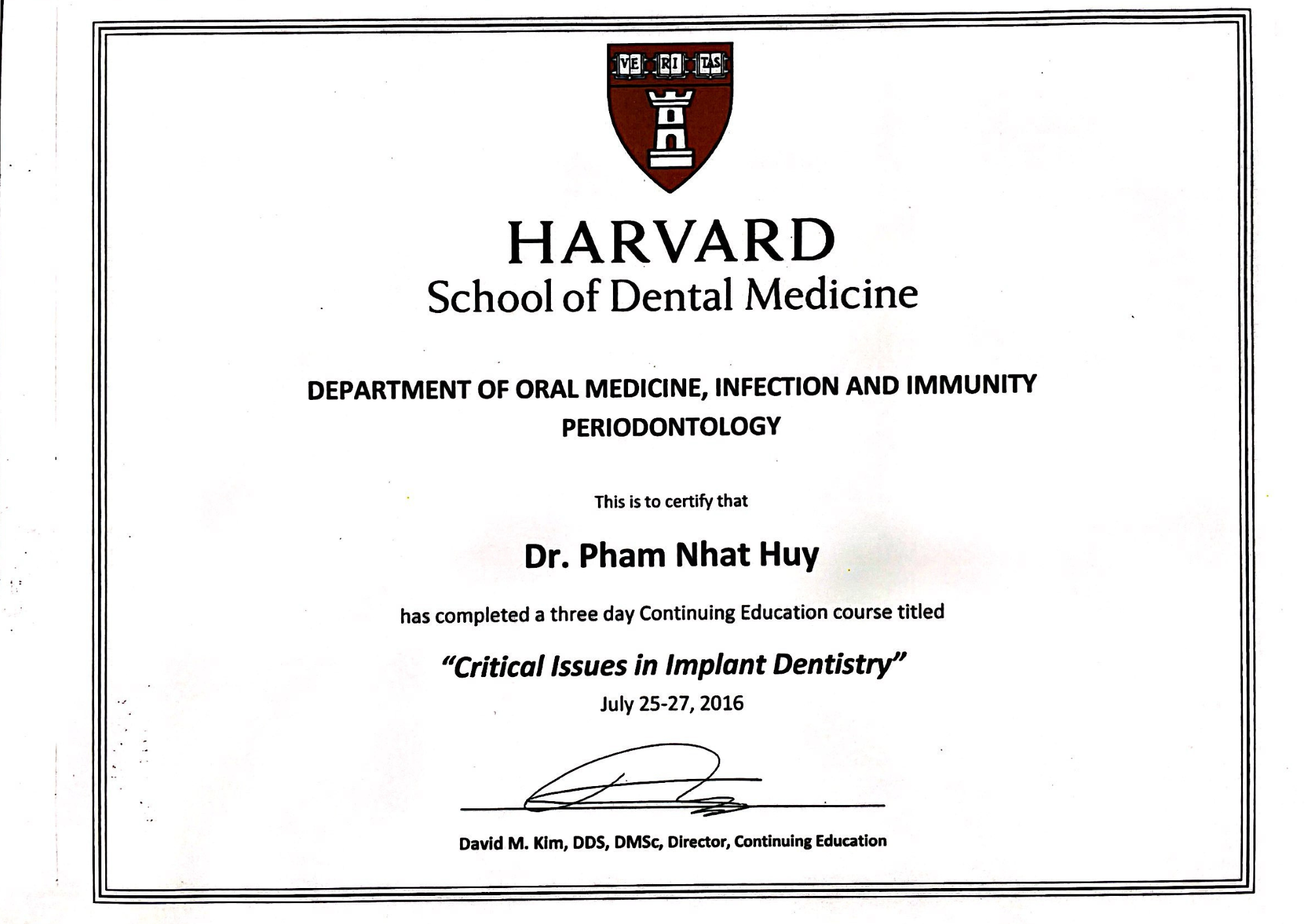 | Certificate in Implant Dentistry: Harvard School of Dental Medicine, USA – 2016 |