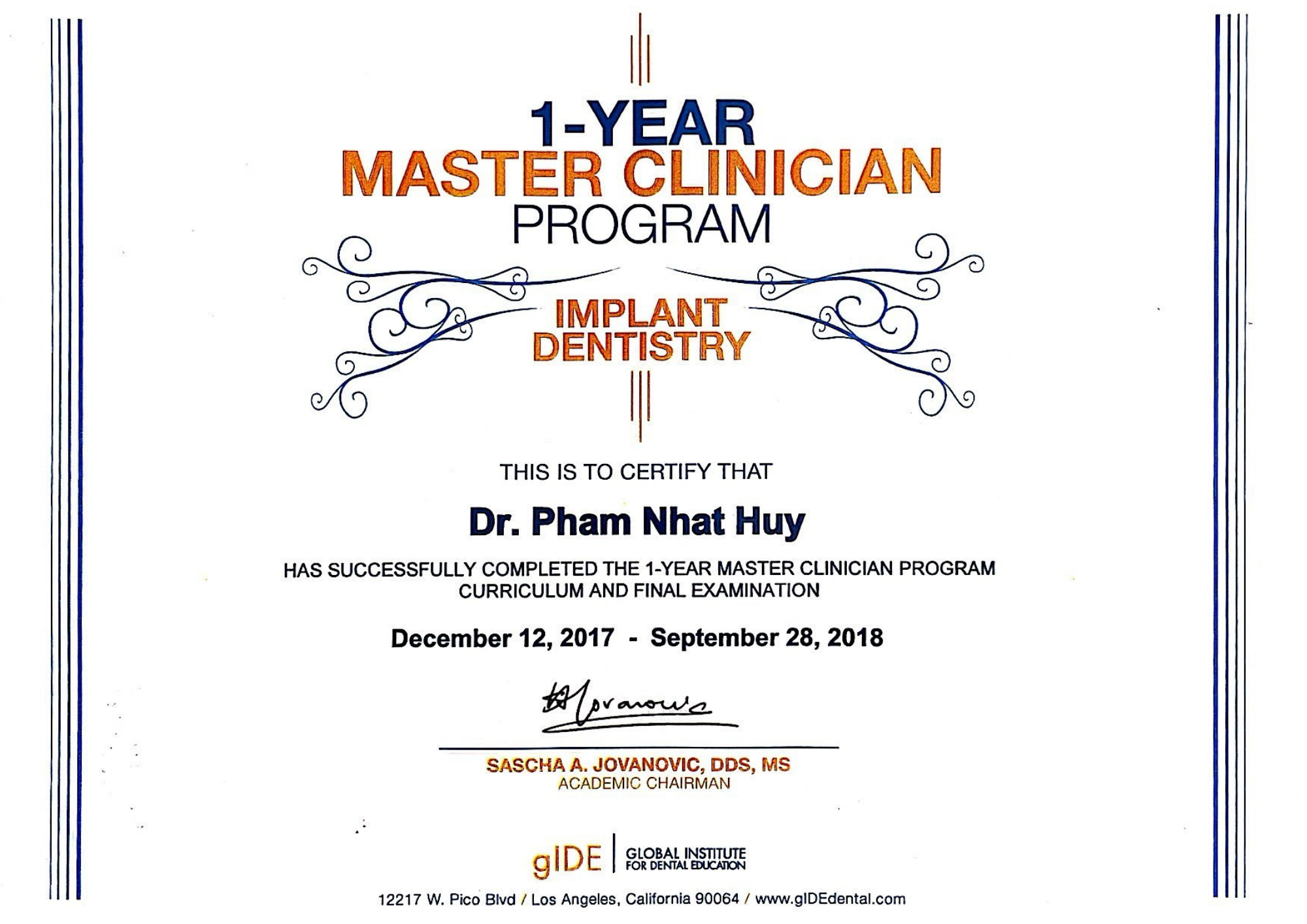 | Master Clinician in Implant Dentistry: Global Institute for Dental Education (gIDE), USA – 2018 |