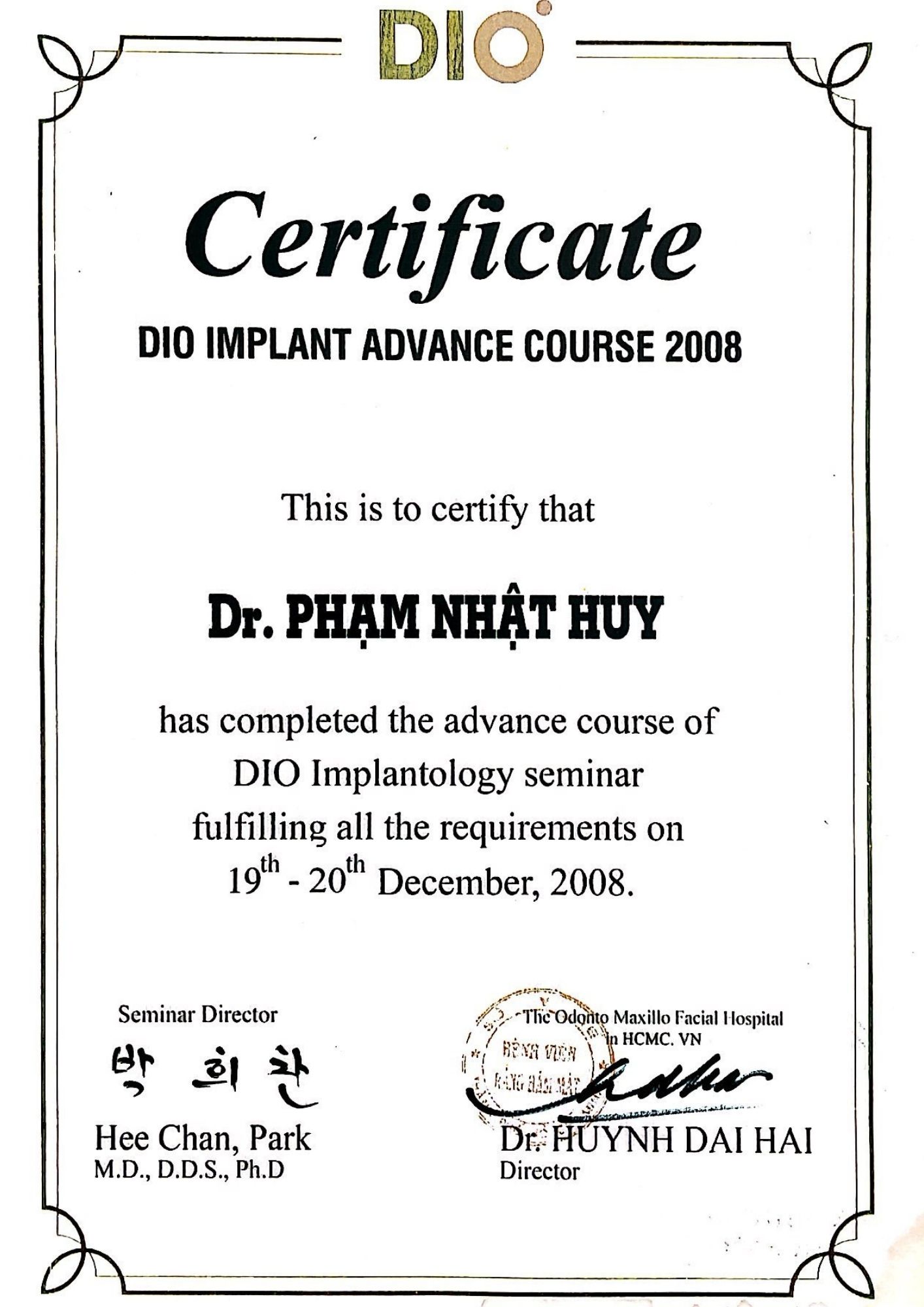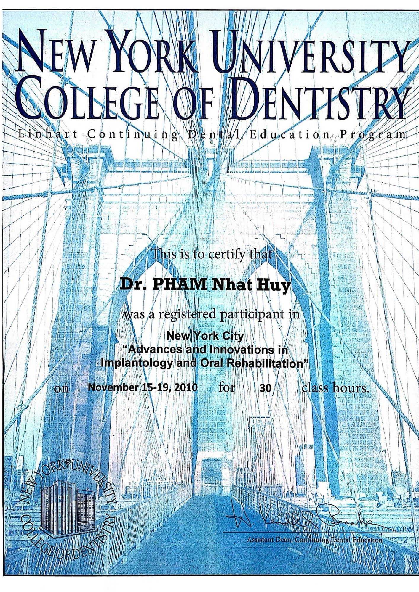 | Certificate in Implant Dentistry: New York University (NYU), USA – 2009 |